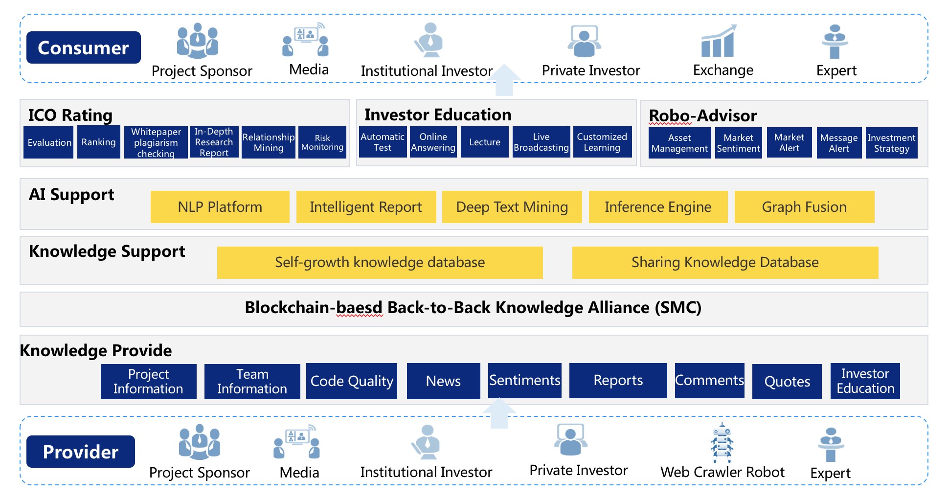 The community employs blockchain technology and secure multi-party computation to solve transaction trust and data privacy problems. Artificial intelligence technology is used to improve the service level and volume of the consultation, investment advisory, and other knowledge providers and achieve a 24/7 all time-zone, full-chain, valuable, highly efficient, robo-advisory and market monitoring services for digital assets. AI can be used to support knowledge sharing and trading of digital assets to solve the problem of asymmetry in market information. In addition, a set of incentive mechanisms ensures that participants with high professional knowledge, high investment level, and high service quality will be able to stand out.