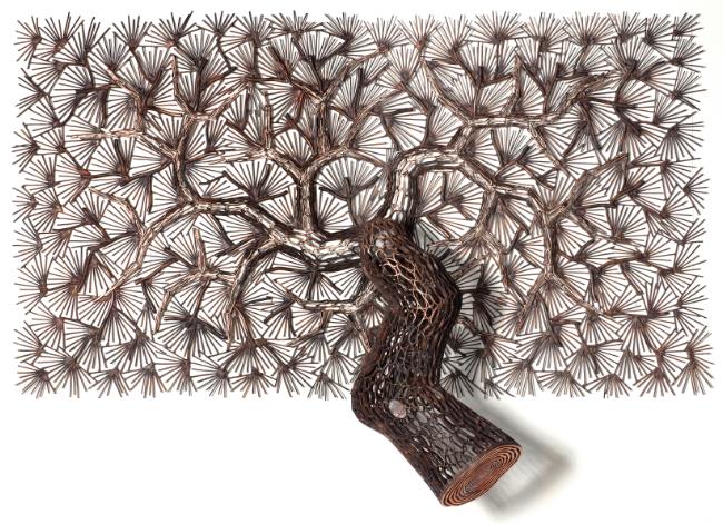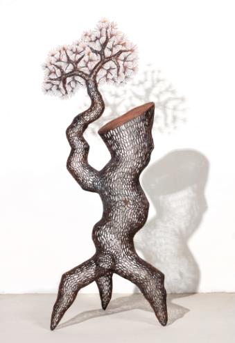李吉來塑造一系列松樹及植物形態的雕塑,將自然與工業元素巧妙融合。他使用銅管勾勒錯綜複雜的繁枝茂葉,展現出大自然的頑強生命力。李吉來的作品彎曲有致,冰冷生硬的銅質物料與生機勃勃的自然生態形成有趣對比。