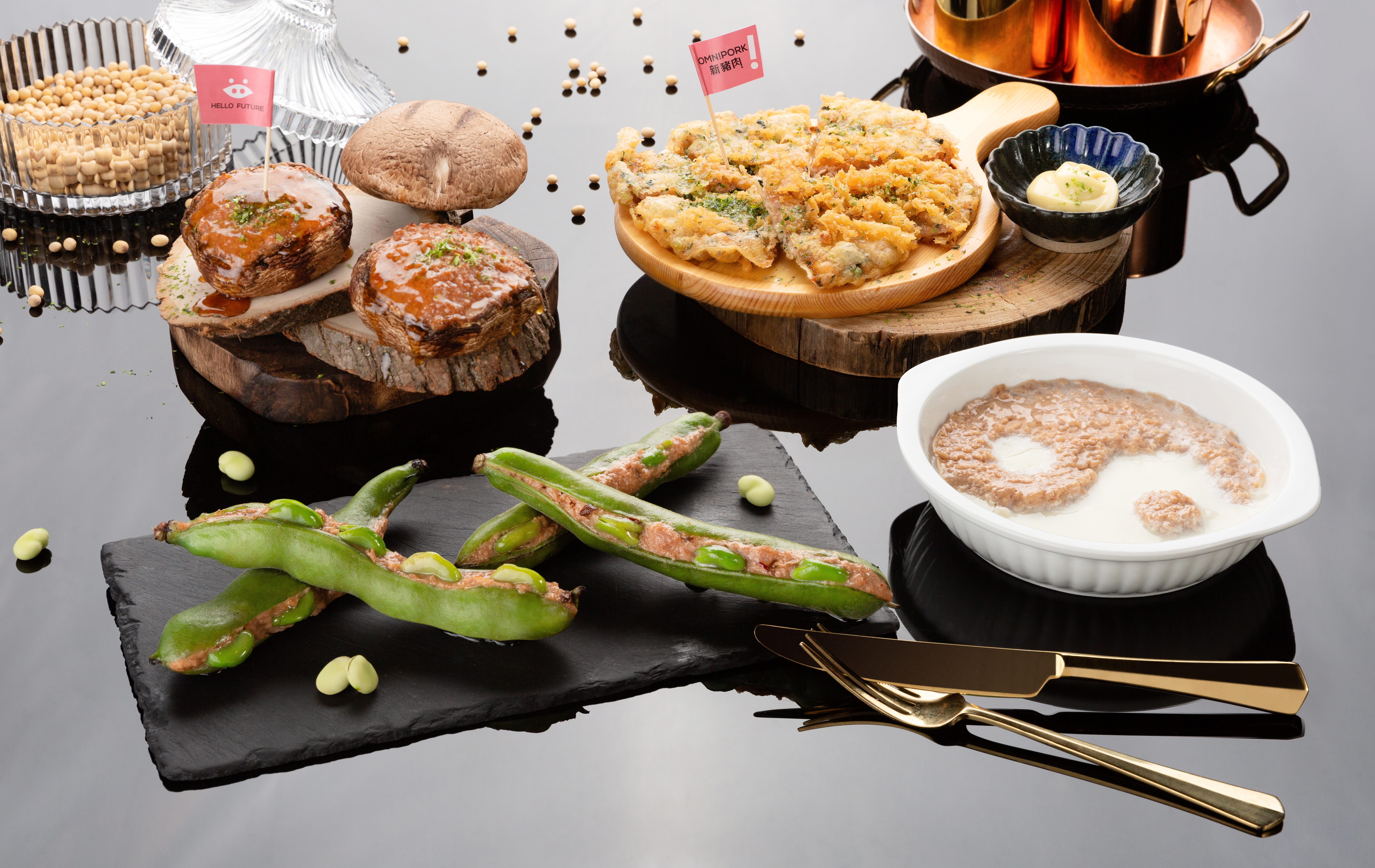 「OMN!PORK新豬肉」由冬菇、豌豆、大米和非基因改造大豆製成,是營養豐富的環保食材。「飲茶」利用「OMN!PORK」取代傳統豬肉,炮製出「不是豬肉酥」(港幣49元),內餡為包裹著秘製叉燒汁的「OMN!PORK」和新鮮菠蘿,再於酥餅面層撒上罌粟籽,香口惹味。