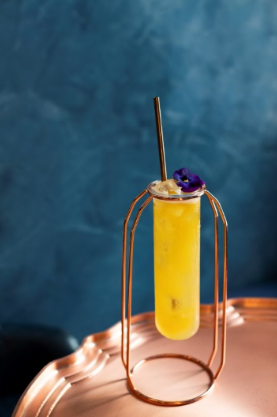 此外,「1997 Punch」回顧香港作爲英國殖民地的最後時光,由Johnnie Walker Black Label威士忌、熱情果、栗子糖漿、檸檬汁、蛋白和梳打水輕搖調配而成。飲品盛於以銅框作爲支架的長杯之中,充滿清新果香,容易入口。