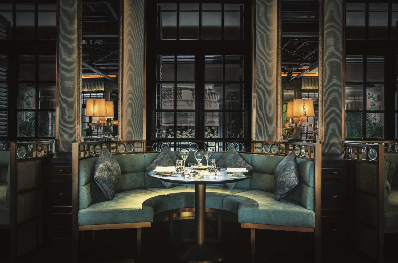 The dining room is a tasteful blend of colonial and Oriental, with artful mood lighting that sets a tone of understated glamour. Jade coloured walls with ornate gold mirrors, backlit onyx screens and black and white antique Chinese marble table tops reimagine the glory of a bygone era.