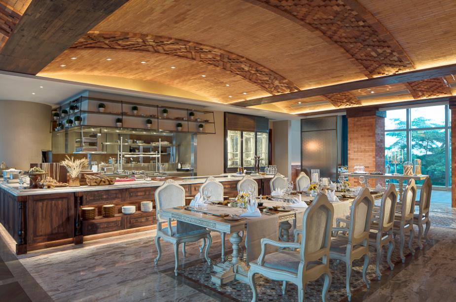 Italian restaurant Allegria is of classic Italian Tuscany décor featuring exquisite decorative elements and patterns, simplicity and elegance of modern aesthetics, while underlining the comfort and utility of furnishings. From the arched ceiling and corridor across different dining areas to the open kitchen, fireplace, furniture and lights, guests can feel relaxing, rich Italian ambience in everywhere of the restaurant.