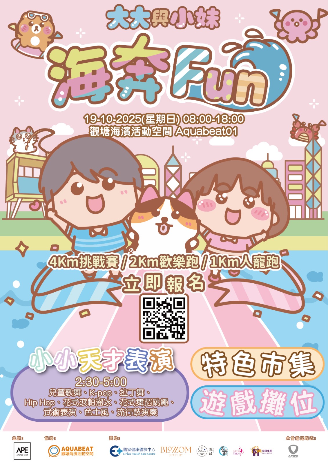 【香港,2025年10月15日】「大大與小妹 海奔Fun」親子活動將於星期日(10月19日)在觀塘海濱公園aquabeat 一號場活力登場!活動由上午8時至下午6時,精心策劃一整日精彩節目,包括設有4公里、2公里及1公里人寵跑的Fun Run、下午「小小天才表演」、特色市集、手作工作坊,更特別設立「毛守狗狗領養及義賣」環節,誠邀全港家庭與毛孩一起投入這個充滿歡笑、愛心與活力的週末派對!