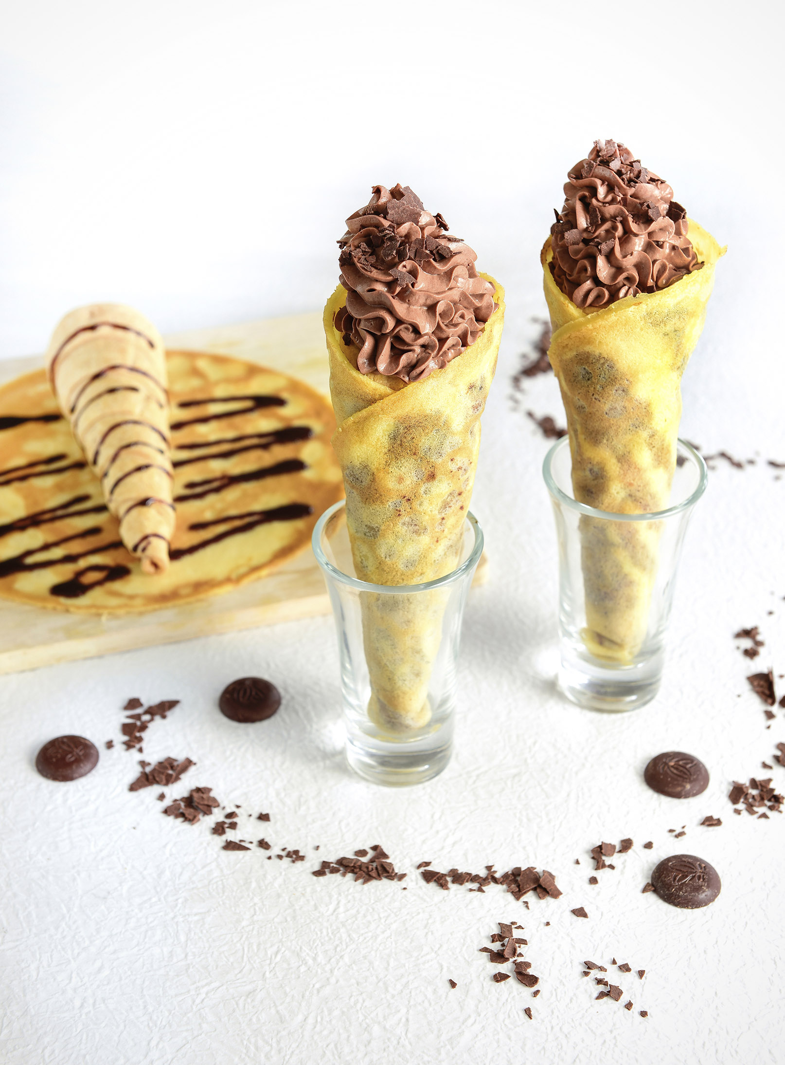 【重拾兒童時光:歐陸版糖蔥餅】自家製香軟班㦸內藏脆脆筒,口感與經典小吃「糖蔥餅」相近,配上瑞士朱古力醬和忌廉,將甜品提升到更高層次!