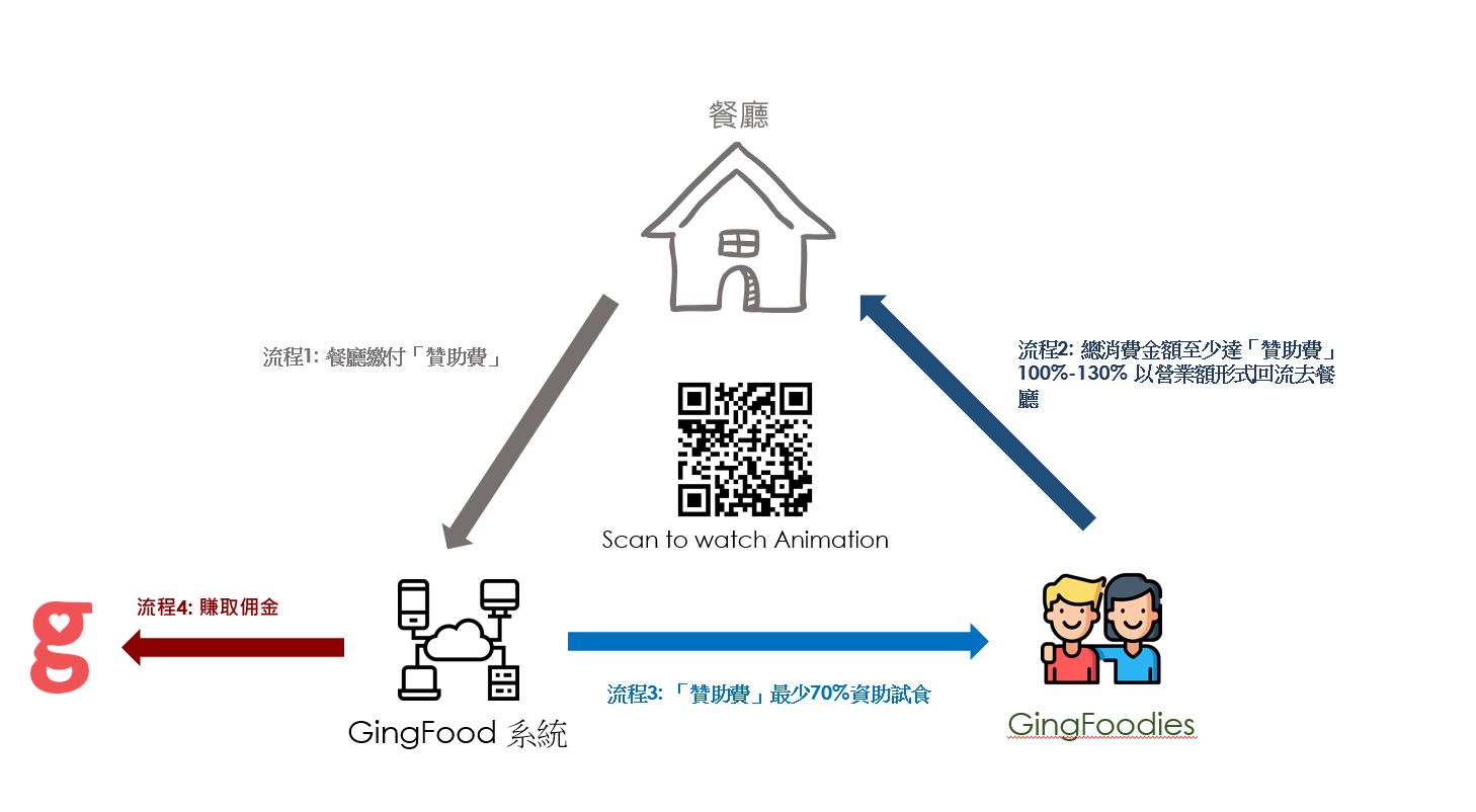 首先,餐廳先向GingFood繳付「贊助費」,GingFood會動員平台上的試食專員到該餐廳消費,再以「贊助費」補貼試食專員。GingFood保證餐廳該筆「贊助費」會為餐廳帶來100%-130% 的營業額 (如「贊助費」為100,000港元,最高可帶來130,000營業額)。餐廳可安心付錢,若不達標GingFood會支付全數差額。若達標的話,餘下的「贊助費」則當作活動佣金,真正創造「三贏」局面 (見附件"流程"):