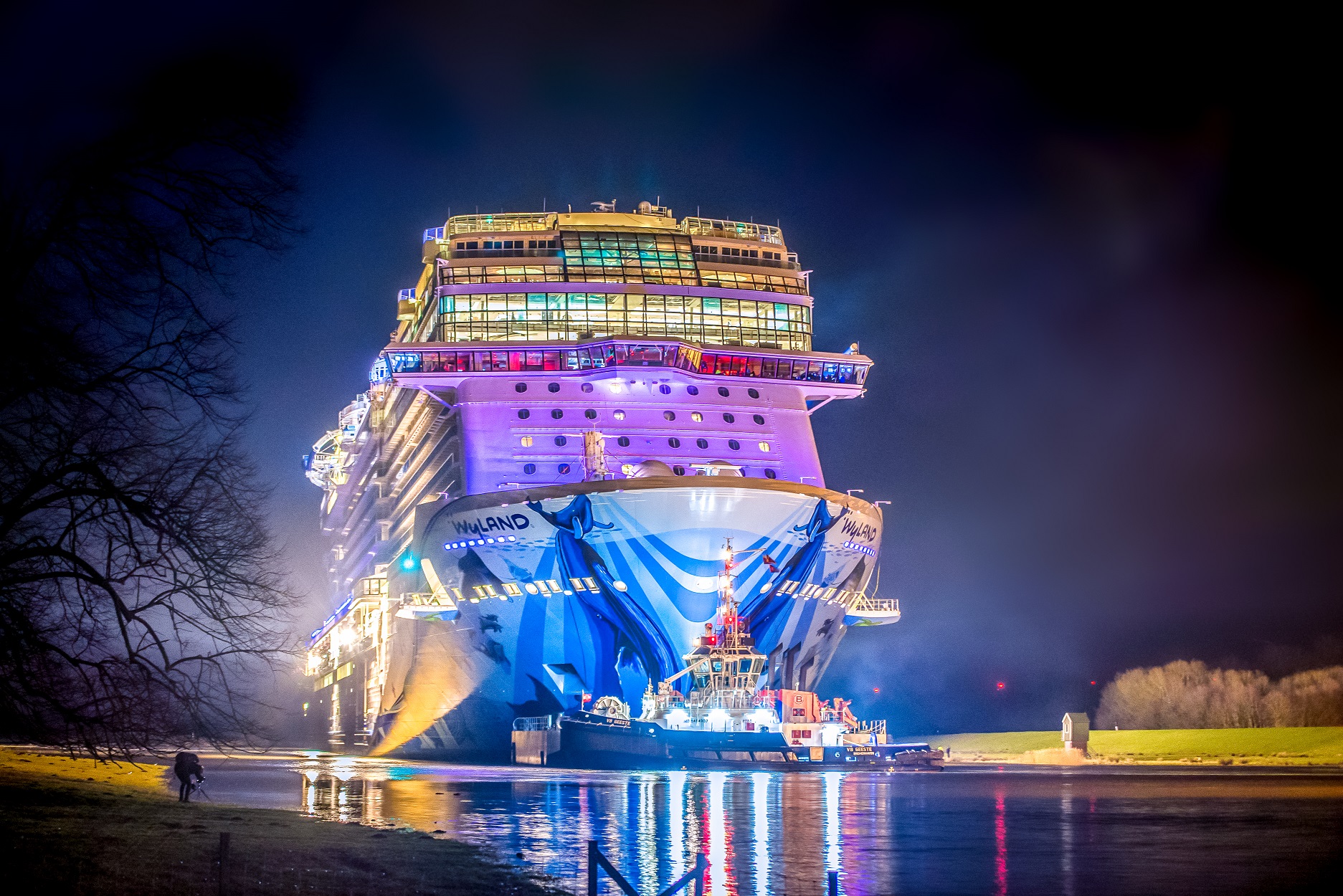 诺唯真畅悦号长1,082英尺(约330米),宽136英尺(约41米),总吨位167,800吨。从迈尔造船厂驶离当日,庞大的船体反向穿过间距仅为4英尺(约1.2米)的狭窄通道,通过船坞区的闸门,沿埃姆斯河驶向北海。这一精密的出闸过程耗时约两个小时,速度仅为0.2节。导航工作由经验丰富的埃姆斯河领航员、指挥人员、船坞主管及当地航道管理部门协同完成。