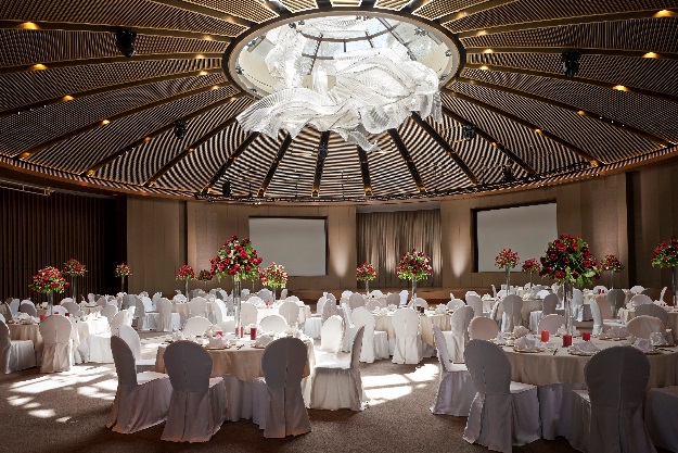 酒店坐拥新加坡首个设有圆形拱顶天窗的大宴会厅,是举办盛大晚宴等活动的绝佳场所。占地8,393平方英尺(约780平米)的无柱大宴会厅采光充足,格调温馨雅致,是举办宴会式庆典(至多400位宾客)和鸡尾酒会(至多700位宾客)的完美之选。宴会厅以玻璃拱顶天窗为亮点,出自世界知名艺术家Nikolas Weinstein之手的宏伟玻璃雕塑悬垂于天窗中央,营造出令人惊艳的自然光影效果。