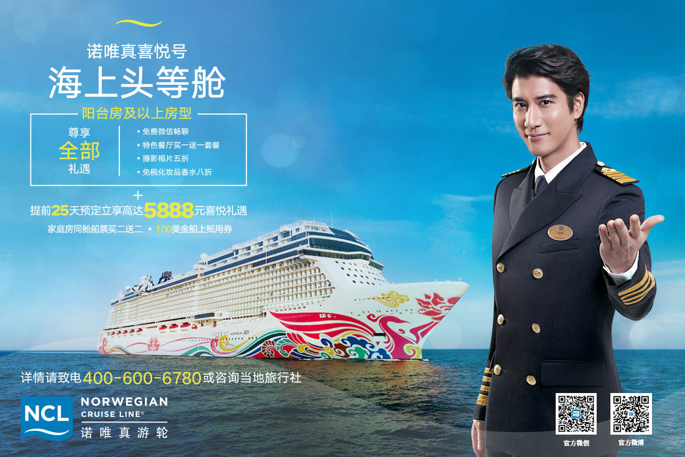 全新发布的广告活动由喜悦号“游轮教父”王力宏领衔,将通过户外广告、电视广告、线上视频网站、数字化平台、社交媒体等多种渠道展开推广,同时也将在国内几大最受欢迎的旅游APP上线,包括携程、同程旅游,以及知名旅游攻略分享网站马蜂窝等。此次全方位活动旨在通过多种传播平台向中国游客宣传诺唯真游轮的品牌使命——打造无与伦比的海上游轮假期,同时分享诺唯真喜悦号的精彩体验。