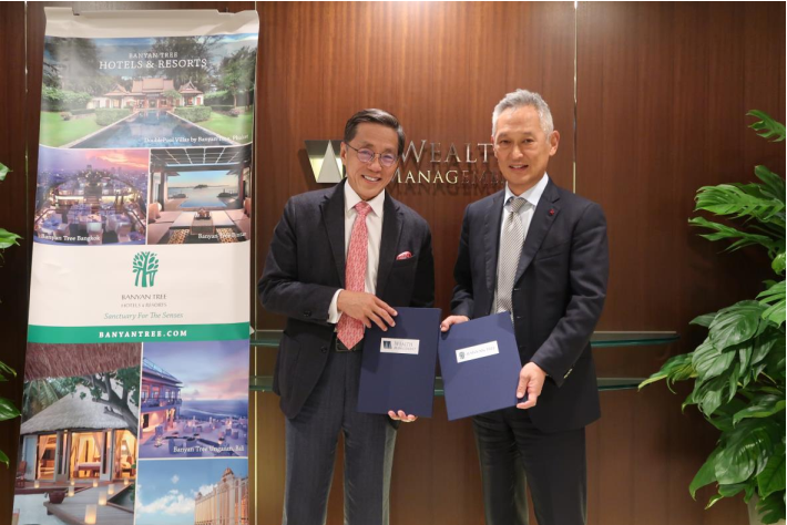 悦榕控股有限公司執行主席何光平先生(左)與Wealth Management Inc.代表董事千野和俊先生(右)在簽約儀式上合影。